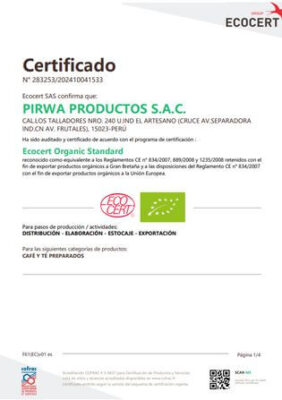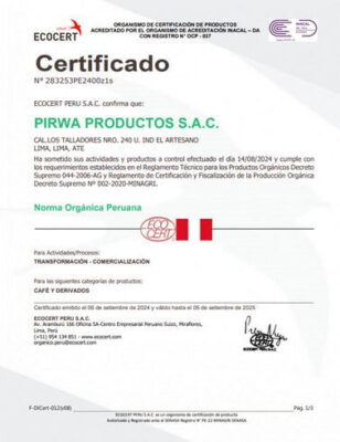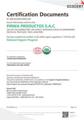 Certificación confirmada por ECOCERT, para procesamiento orgánico de acuerdo con normas en Mercosu, USA y EU.