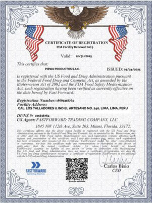Certificación PGH de DIGESA, que garantiza la calidad e inocuidad del producto, y registro en la FDA.